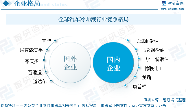 目前,全球汽车冷却液市场参与者众多,竞争较为激烈,主要包括壳牌、嘉实多、埃克森美孚、百适通、道达尔、福斯等国际知名品牌和长城润滑油、昆仑润滑油、统一润滑油、德联化工、龙蟠、康普顿等国内地区性品牌。这些企业在汽车冷却液产品的研发、生产和销售方面具有较高的实力和市场份额,拥有广泛的客户群体和良好的品牌口碑。