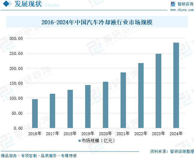 汽车冷却液作为汽车发动机的关键组成部分,主要是吸收并处理发动机工作时产生的多余热量,确保发动机能在适宜的温度范围内运行。汽车冷却液不足会导致发动机水温过高,进而造成发动机部件损坏。因此,车主应及时检查并补充冷却液。此外,汽车冷却液还具备多重功效:冬季时,它能防止冷却液结冰,避免水箱和发动机缸体爆裂;它含有防腐添加剂,能有效预防冷却系统内部的电化学腐蚀和酸性腐蚀;同时,汽车冷却液还能减少水垢生成,保持循环管道的畅通,确保冷却系统的散热效果。近年来,随着中国汽车市场的快速增长,汽车冷却液市场规模不断增长。数据显示,中国汽车冷却液行业市场规模从2016年的96.28亿元增长至2024年的284.9亿元,年复合增长率为14.52%。随着汽车产业升级和新型冷却液产品不断涌现,未来汽车冷却液行业将迎来更广阔的发展空间。