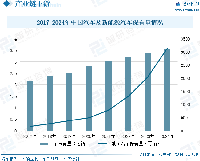 冷却液作为汽车冷却系统的关键组成部分,对保障汽车发动机在适宜温度下稳定运转起着不可或缺的作用。在当今社会,汽车已成为人们日常生活中不可或缺的交通工具,其市场保有量不仅反映了国家经济的发展水平,也体现了居民生活质量的提升。近年来,随着科技的进步、政策的推动以及消费者需求的多样化,我国汽车市场的保有量持续增长。公安部数据显示,中国汽车保有量从2017年的2.17亿辆增长至2024年的3.53亿辆,年复合增长率为7.2%。在机动车保有量中占比从2017年的70%提升至2024年的77.92%。其中,新能源汽车保有量从2017年的154万辆增长至2024年的3140万辆,年复合增长率达到53.84%。我国汽车及新能源汽车保有量的持续增长为汽车冷却液行业提供了更大的发展空间。