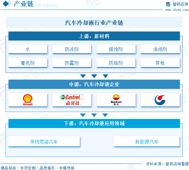 汽车冷却液产业链上游为原材料,包括水、防冻剂、缓蚀剂、消泡剂、着色剂、防霉剂、防垢剂等,这些原材料通过精确的配比和严格的工艺流程进行复合加工,最终形成具有特定冰点、沸点、防腐性和稳定性的专业冷却液产品。产业链下游主要服务于汽车领域,涵盖传统燃油车和新能源汽车两大市场领域。在传统燃油车应用中,汽车冷却液主要用于发动机循环系统的温度调节,通过有效地热交换维持发动机在最佳工作温度区间运行;而在新能源汽车领域,汽车冷却液的应用范围进一步扩展至动力电池组、电机和电控系统的热管理,其性能要求更为严苛,需要具备更高的导热效率和更优的绝缘特性。