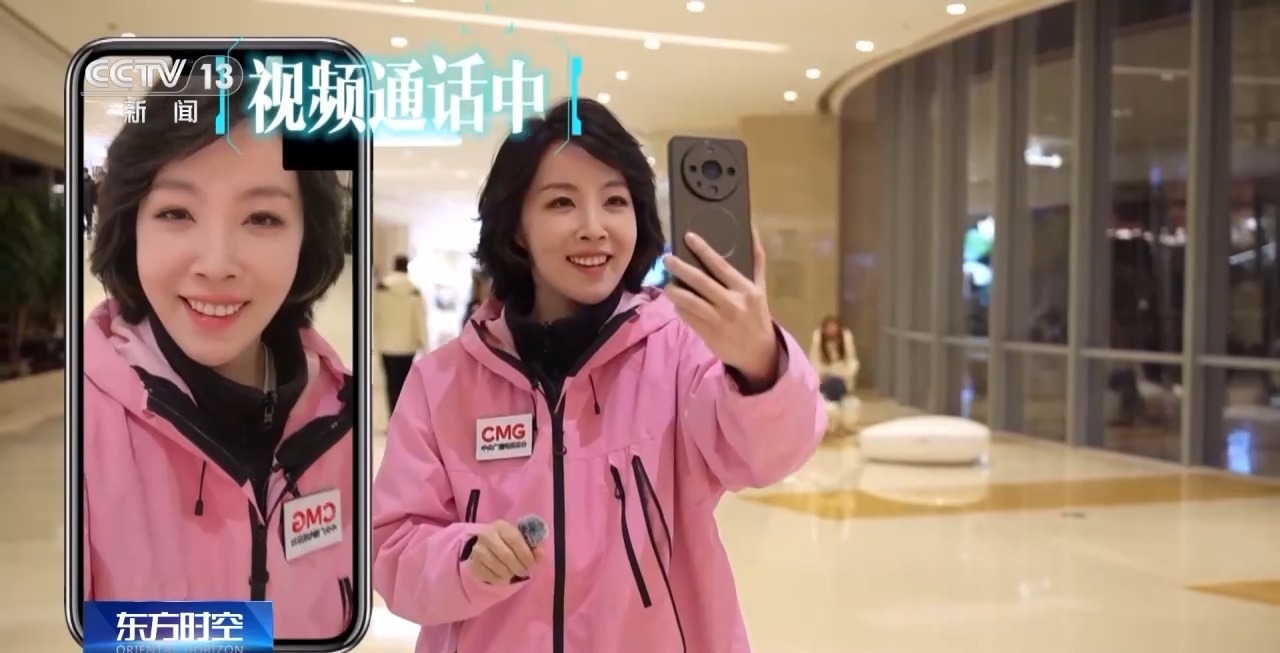 随后,主播王言用这款智能眼镜,与同事刘妙然开启视频连线。此时,总台央视新闻主播刘妙然正在安徽的街头,采访大家打算买什么“电子年货”。