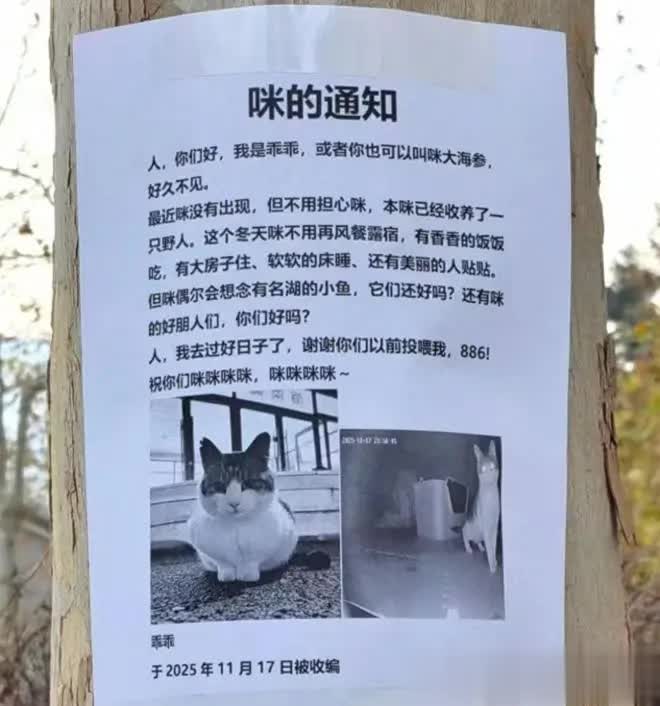最近,大连大学校园里流传的一张“咪的通知”,就带来了这样一个治愈人心的故事。