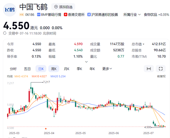 7月7日,中国飞鹤股价开盘即跌14.91%,报4.85港元/股;盘中跌幅持续扩大,一度探至4.65港元/股,最大跌幅超18%;截至发稿前,其股价4.55港元/股,市值412.51亿。