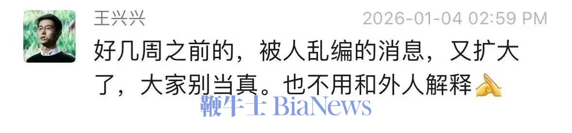 王兴兴表示,“好几周之前的,被人乱编的消息,又扩大了,大家别当真。也不用和外人解释。”