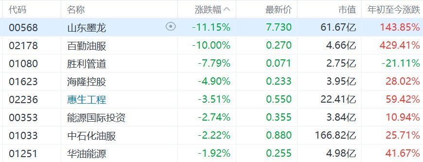 港股市场油气设备与服务股集体跳水,其中,山东墨龙跌超11%,百勤油服跌10%,胜利管道跌超7%,海隆控股跌近5%。消息面上,随着特朗普表示,无论是否达成协议,美国都将在两三周内撤离伊朗,国际油价应声下跌。WTI原油失守98美元/桶,日内跌近4%;布伦特原油跌破98美元/桶,日内跌超4%。凯投宏观的Thomas Mathews表示:“局势降温的希望提振了市场,但我们认为,即便战争很快结束,其影响在许多情况下仍将持续。毕竟双方在战争的其他阶段也曾释放过积极信号,但其中许多最终都化为泡影。”
